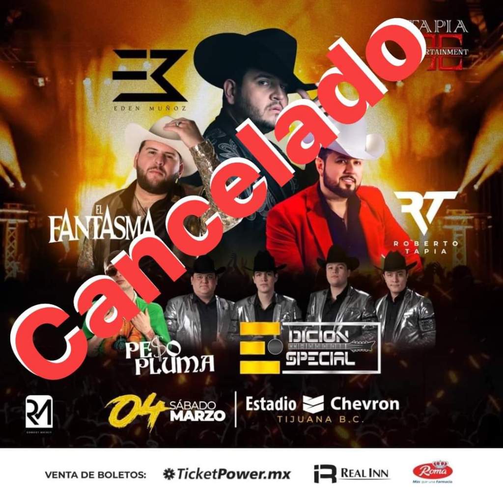 De nueva cuenta el tema de inseguridad en la ciudad ha pasado a afectar a otro espectáculo de regional mexicano en Tijuana. A través de un comunicado emitido la tarde de este miércoles 22 de febrero, Tapia Entertainment indicó que el concierto de los cantantes Edén Muñoz, El Fantasma y Peso Pluma, programado para el 4 de marzo en el Estadio Chevron queda suspendido.