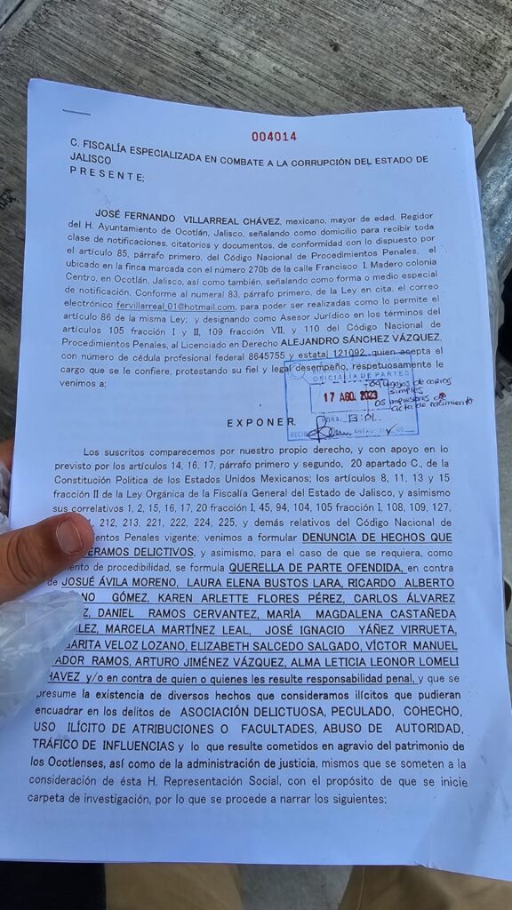 El Alcalde de Ocotlán, Josué Ávila Moreno, fue denunciado ante la Fiscalía en Combate a la Corrupción por los delitos de asociación delictuosa, peculado, cohecho y desvío de recursos.