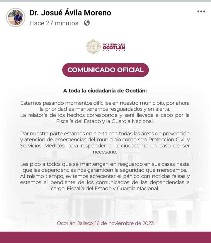 El presidente municipal Josué Ávila, llamó a los habitantes de Ocotlán a resguardarse en sus casas hasta que se garantice la seguridad.