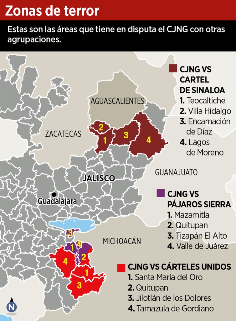 En Teocaltiche, Villa Hidalgo, Encarnación de Díaz y Lagos de Moreno, el CJNG mantiene una disputa por el control de la zona con una célula del Cártel de Sinaloa.