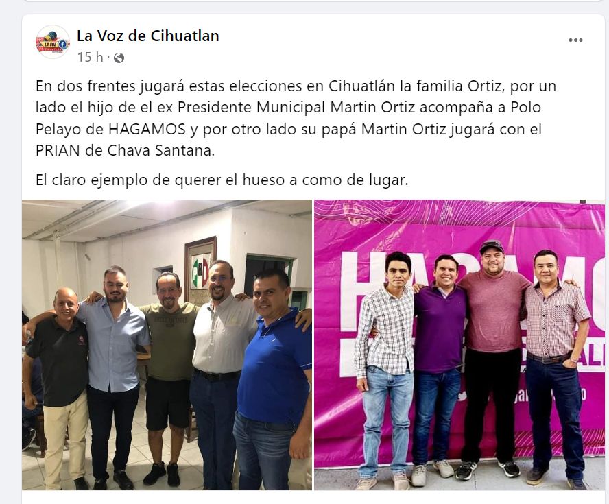 “En dos frentes jugará estas elecciones en Cihuatlán la familia Ortiz, por un lado el hijo de el ex Presidente Municipal Martin Ortiz acompaña a Polo Pelayo de HAGAMOS y por otro lado su papá Martin Ortiz jugará con el PRIAN de Chava Santana.