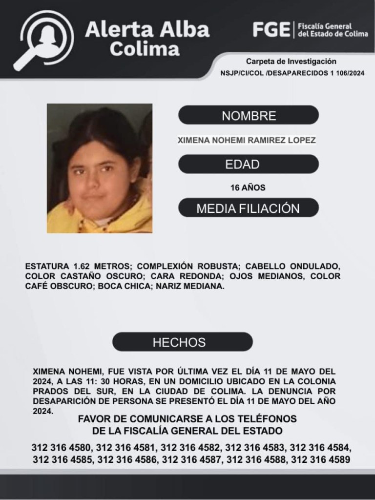 La Fiscalía General del Estado de Colima ha lanzado una alerta por la desaparición de Ximena Nohemi Ramirez Lopez, de 16 años de edad. Según reportes, fue vista por última vez el 11 de mayo de 2024, a las 11:30 horas, en un domicilio ubicado en la colonia Prados del Sur, en la ciudad de Colima.