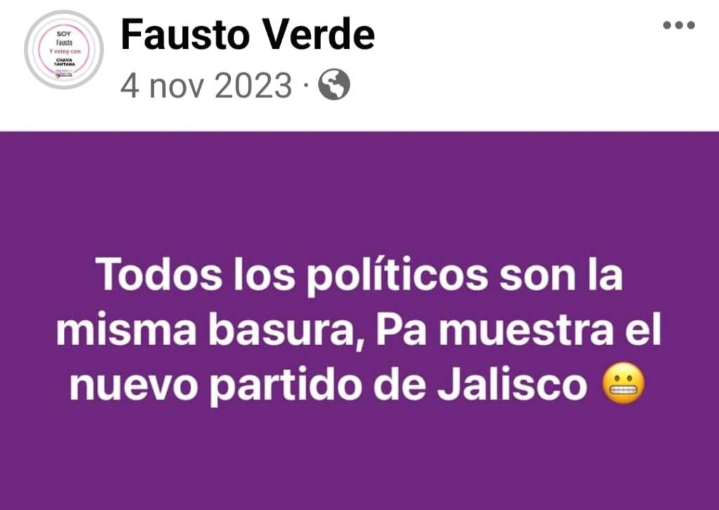 En este 2024, todavía a principios del año, luego de su rompimiento con el grupo político de Hagamos, a quienes comenzó a criticar y lanzar indirectas a través de las redes sociales, Fausto Verde se exhibió como uno de los promotores del presidente municipal Jorge Salas Chávez, del Partido Movimiento Ciudadano.