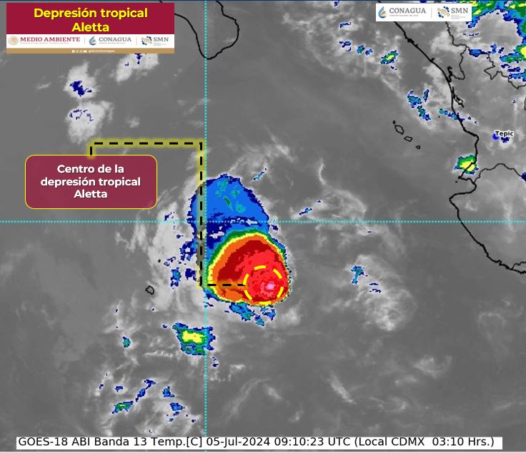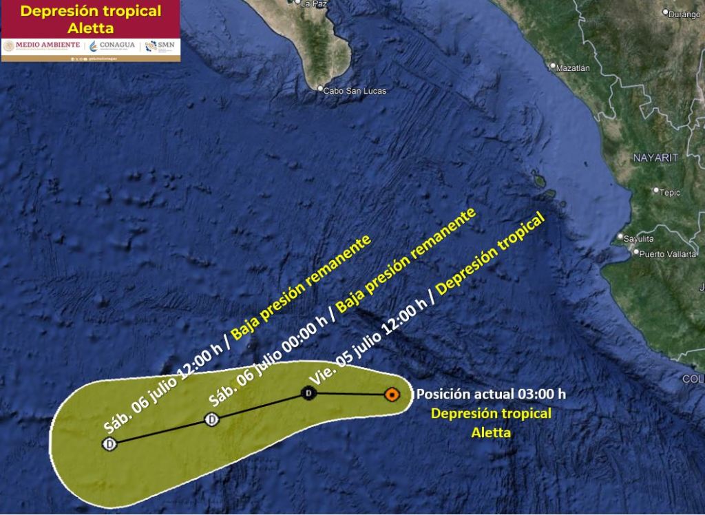 Este viernes 5 en la madrugada, la depresión tropical Aletta sigue alejándose de las costas de Michoacán, Colima y Jalisco, así lo confirman en el Servicio Meteorológico Nacional (SMN), fuente oficial del Gobierno de México.