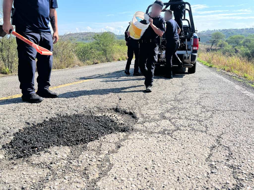 En el Distrito 18 de Jalisco, policías de la comisaria de seguridad publica de Tecolotlán se sumaron a las tareas de bacheo en la carretera federal 80.