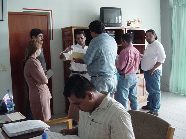 2002: El presidente de Cihuatlán, Jesús Enrique Morett Mendoza, rodeado de sus principales colaboradores y asesores en la oficina presidencial.