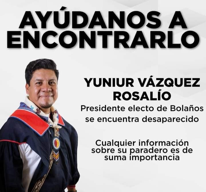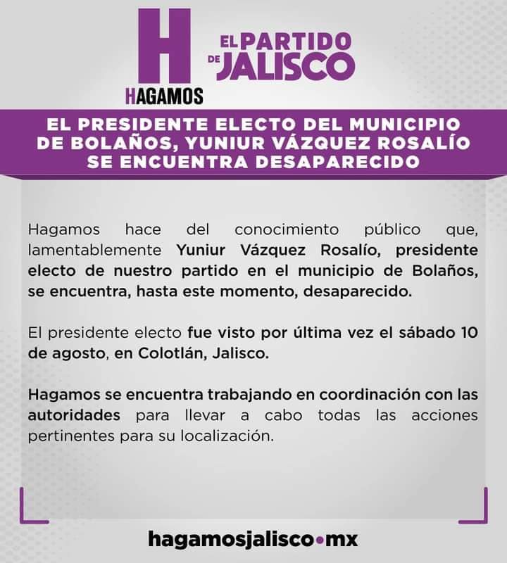 «De manera preliminar, los rasgos y prendas coinciden con el presidente electo del municipio de Bolaños, Yuniur Vázquez Rosalío, y su acompañante, Antonio Carrillo González.