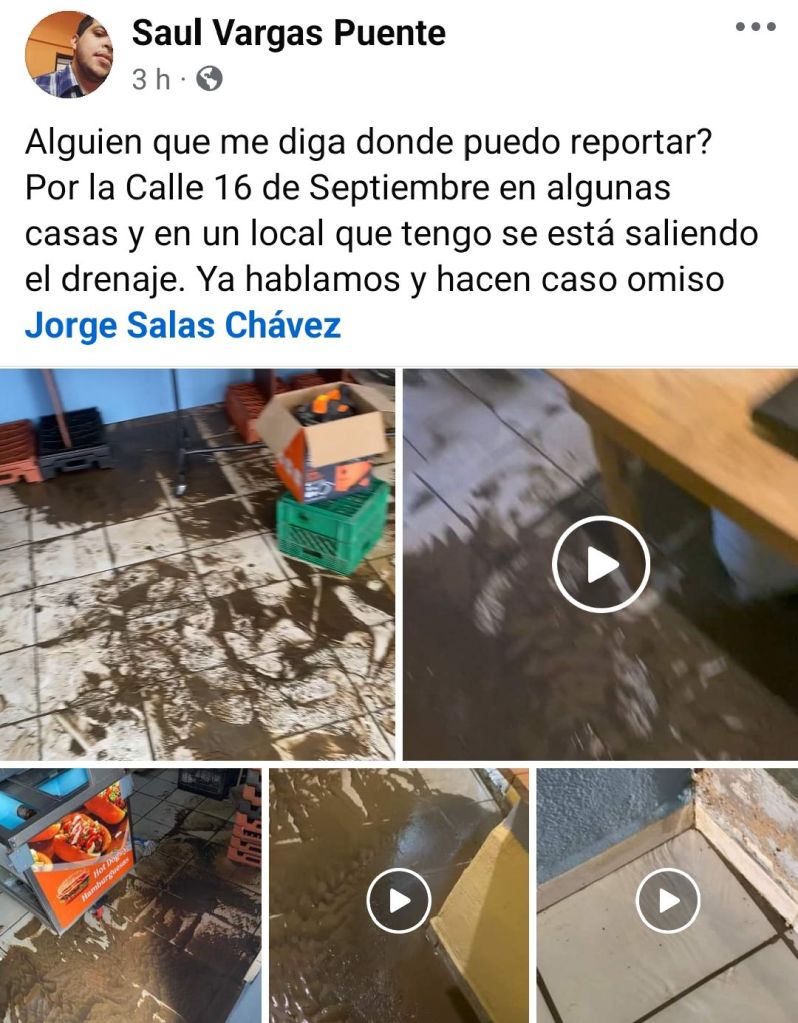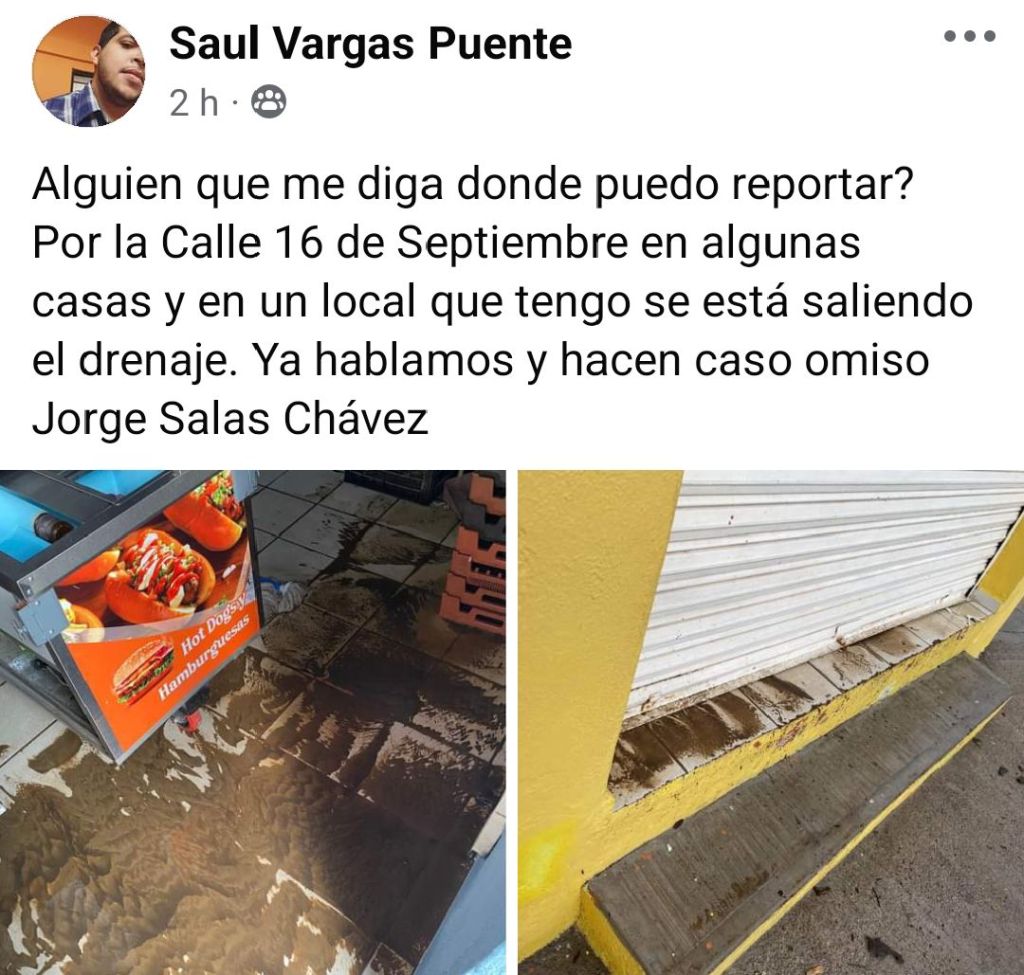 «Alguien que me diga donde puedo reportar? Por la Calle 16 de Septiembre en algunas casas y en un local que tengo se está saliendo el drenaje. Ya hablamos y hacen caso omiso Jorge Salas Chávez», expresó.