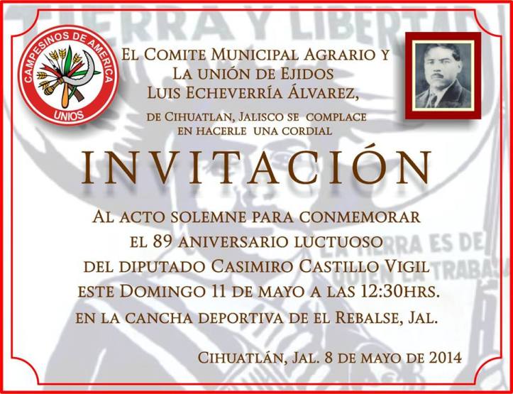 Todavía este viernes 9 de Mayo, en la tarde, el comité municipal agrario de Cihuatlán difundía la invitación para conmemorar el aniversario luctuoso el próximo 11 de Mayo, en la comunidad de El Rebalse.