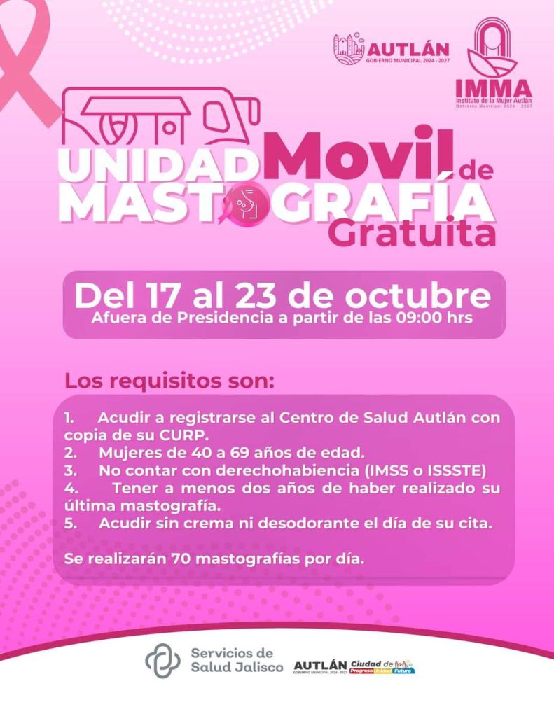 El Gobierno de Autlán a través del Instituto De La Mujer Autlán invita a todas las mujeres a aprovechar la Unidad Móvil de Mastografía gratuita que Servicios de Salud Jalisco ofrecerá del 17 al 23 de octubre de 2024, frente al Palacio Municipal, desde las 9:00 a.m.